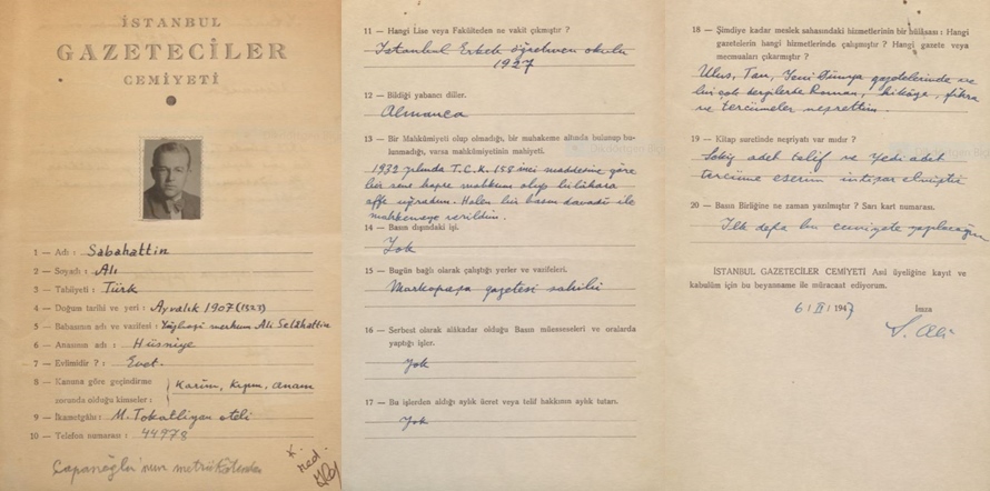 Basın ve yayın hayatından söz açılmışken, 1947’de İstanbul Gazeteciler Cemiyeti’ne de üyelik başvurusunda bulunur Sabahattin Ali.
