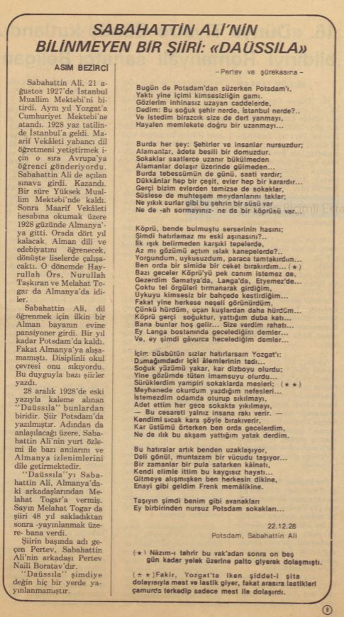 Burada, I. Dünya Savaşı’nda Türkiye’de bulunan eski bir subaydan ders alır ve Berlin’de yatılı okula gitme imkanı bulur. Ali’nin yaklaşık 2 yıl süren Almanya macerası ona birçok şey katmasıyla beraber canının fena derecede sıkıldığı ve memleket özlemi çektiği dönemleri de olur. Almanya’da Gorki, Turgenyev, Edgar Allen Poe, Hamsun ve adı “olay hikayeciliği” ile bütünleşen Maupassant gibi yazarları Almancalarından okuyup onlardan etkilenir. Ancak sıkı ve hatta kimilerine göre katı disiplinli yaşam tarzıyla bilinen Almanya, sıkıya fazla gelmeyi sevmeyen, özgür ruhlu yazarımız için zor zamanlara da neden olur. Edebiyat eleştirmeni Asım Bezirci tarafından ortaya çıkarılan, Ali’nin Almanya’da yazdığı bir şiir de bunu ortaya döker. “Daüssıla” adlı bu şiiri Sabahattin Ali, Almanya’daki arkadaşlarından Melahat Togar‘a vermiş vaktiyle. Melahat Hanım da şiiri 48 yıl sakladıktan sonra, yayımlaması üzerine Asım Bezirci’ye vermiş. 22 Aralık 1928’de yazılan bu şiirin başında “Pertev ve şürekasına” notu vardır. Söz konusu Pertev, Pertev Naili Boratav’dır.