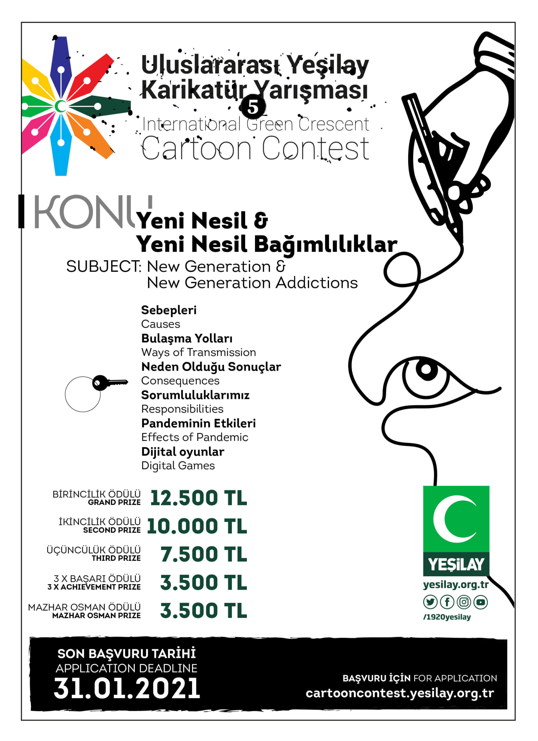 Yeşilay, bağımlılığın etkilerini yaratıcı bir dille gündeme getiren Uluslararası Yeşilay Karikatür Yarışması’nı 5’inci kez düzenliyor. Yarışmaya katılan eserlerden bu sene “Yeni Nesil ve Yeni Nesil Bağımlılıklar” ana teması altında bu bağımlılıkların sebepleri, bulaşma yolları, neden olduğu sonuçlar, sorumluluklar ile pandeminin etkileri ve dijital oyunlar başlıklarında; online bahis ve online kumar bağımlılıklarına odaklanmaları bekleniyor. Dünyadan ve Türkiye’den profesyonel ve amatör tüm karikatüristlerin katılımına açık olan yarışmanın başvuruları 31 Ocak 2021 tarihine kadar cartooncontest.yesilay.com.tr adresinden yapılacaktır.
