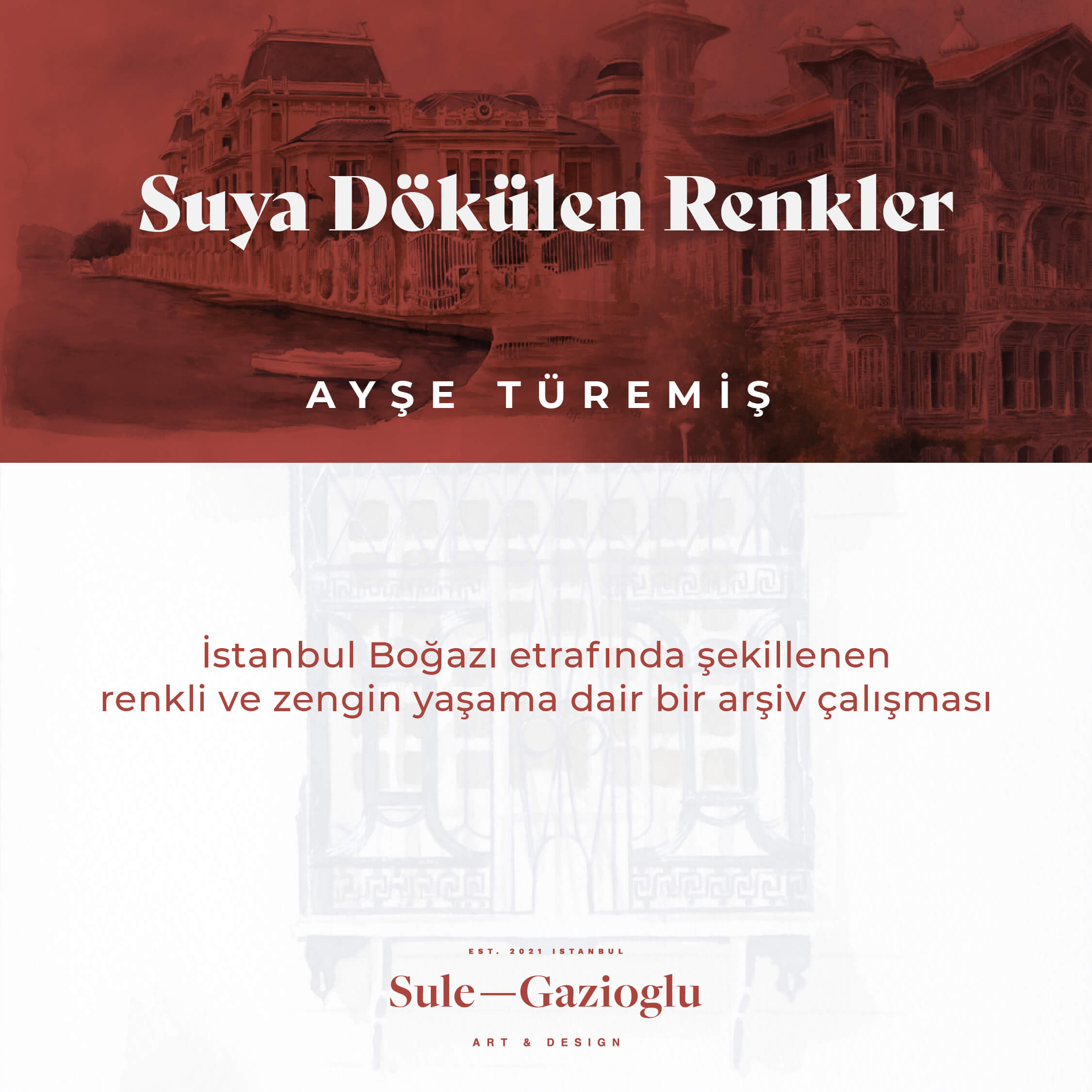İstanbul’un mimari ve kültürel mirasında önemli bir yer tutan Boğaz semtlerini ve bu semtlerde suyun etrafında yeşeren yaşamı konu alan “Suya Dökülen Renkler” sergisi, ressam Ayşe Türemiş ve Şule Gazioğlu Art & Design’ın, bu eşsiz mirası koruma vizyonlarının birleşmesiyle ortaya çıkan özel bir koleksiyonla sanatseverlerin karşısına çıkıyor.