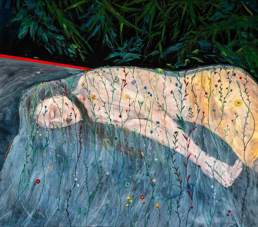 Geleneksel ile çağdaş olan arasında yankılanan bu yapıtlarda, tekstil malzemesinin eserin anlamına dair kullanımı çağcıl bir kaygının, bir tür kültürel aidiyetin karşılığıdır. Tülün yanı sıra dikiş ipiyle örüntülenen biçimlendirmelerde karşılaştığımız uygulamaların arz ettiği çizgisel efektin bir yanı desen pratiğine ait bir duyarlılığa, diğer yanı ise zamansal bir kaygıya, bir tür Zeitgeist’a yaslanır. Zira uzayda iki nokta arasındaki 1 yol çizgi olarak tanımlandığında bu mesafenin neyle betimlendiği zamansal aidiyet ve o ana dair yaşananlarla kaçınılmaz biçimde ilişki içindedir. Öte yandan el yordamıyla kotarılan iplik örüntüsünün biçimlendirdiği çiçek, yaprak, dal vb. gibi doğa motiflerinin sanayi üretimi olan tül kumaşlar üzerine de nakşedilmiş olduğu göz önüne alındığında, tema, ölçek veya renklendirme tercihleri itibariyle birbirinden ayrılan eserler bu suretle birbirine bağlanır. Rengarenk iplerle suretlere tırmanan çiçek, yaprak gibi motifler doğal bir varlığa yapay ve/fakat renkli bir müdahaledir aslında. Yapay ile doğal arasında salınımlı bir dilsel yönelim gösterdiği bu yaklaşımla, sanatçının hayata kurgu ile gerçek aralığından baktığını söyleyebiliriz. Sanatçının yukarıda anılan sanatsal ifade kaygılarının gündelik yaşamın gizil tezahürü olduğu; durumun bilişsel olandan duyusal olana kadar genişleyen bir alana yayıldığı; eserlerin üretim sürecinde akıl egemen başlayan ve/fakat duygu egemen olarak sonuca ulaşan çıktılara dönüştüğü; gerek portrelerin gerekse doğa ölçeği içinde iyiden iyiye küçülen figürlerin, bahsi geçen kültür-hayat ilişkisinin dramatik tezahürü olduğu; gündelik hayat denilen kurgu içinde cinsel figürana dönüş/türül/en yetişkin kadın veya çocuk/su geline gönderme yapan figürasyonun merkeze alındığı kabul edildiğinde, bu sergi kadının sosyo-kültürel yaşamdaki varlığının feminist bir söylemle eleştirisinden oluşur. – Doç. Orçun ÇADIRCI – Mersin Üniversitesi Güzel Sanatlar Fakültesi / Resim Bölümü Öğretim Üyesi