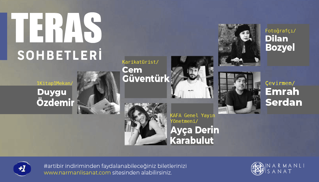 “Narmanlı Sanat Teras Sohbetleri” serisinin edebiyat sohbetleri dizisi, farklı disiplinlerden gelen fakat üretimleri edebiyat ile kesişen karikatürist Cem Güventürk, Kafa dergisinin direktörü Ayça Derin Karabulut, fotoğrafçı Dilan Bozyel ve editör, çevirmen Emrah Serdan’ı bir araya getiriyor. Sohbetler, 1 Kitap 1 Mekan’ın kurucusu Duygu Özdemir moderatörlüğünde dört farklı günde, her konuşmacının uzmanlığına göre kurgulanan temalar üzerinden 15, 20, 22, 27 Eylül tarihlerinde gerçekleşiyor.