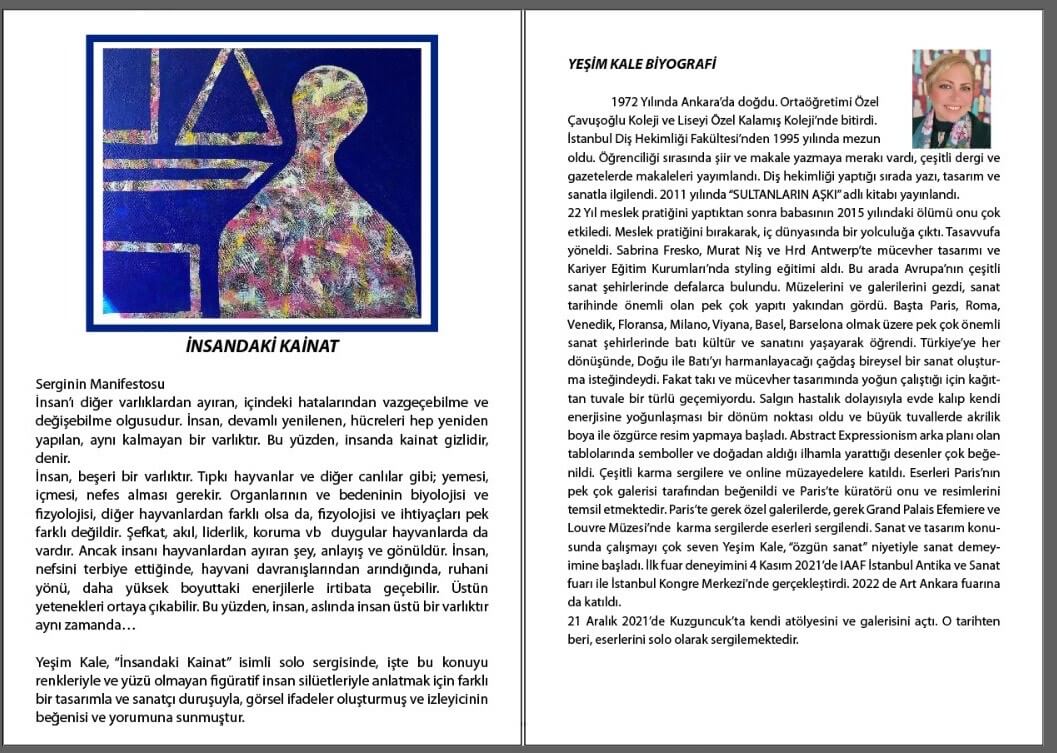 Yeşim Kale, “İnsandaki Kainat” isimli solo sergisinde, işte bu konuyu renkleriyle ve yüzü olmayan figüratif insan silüetleriyle anlatmak için farklı bir tasarımla ve sanatçı duruşuyla, görsel ifadeler oluşturmuş ve izleyicinin beğenisi ve yorumuna sunmuştur.