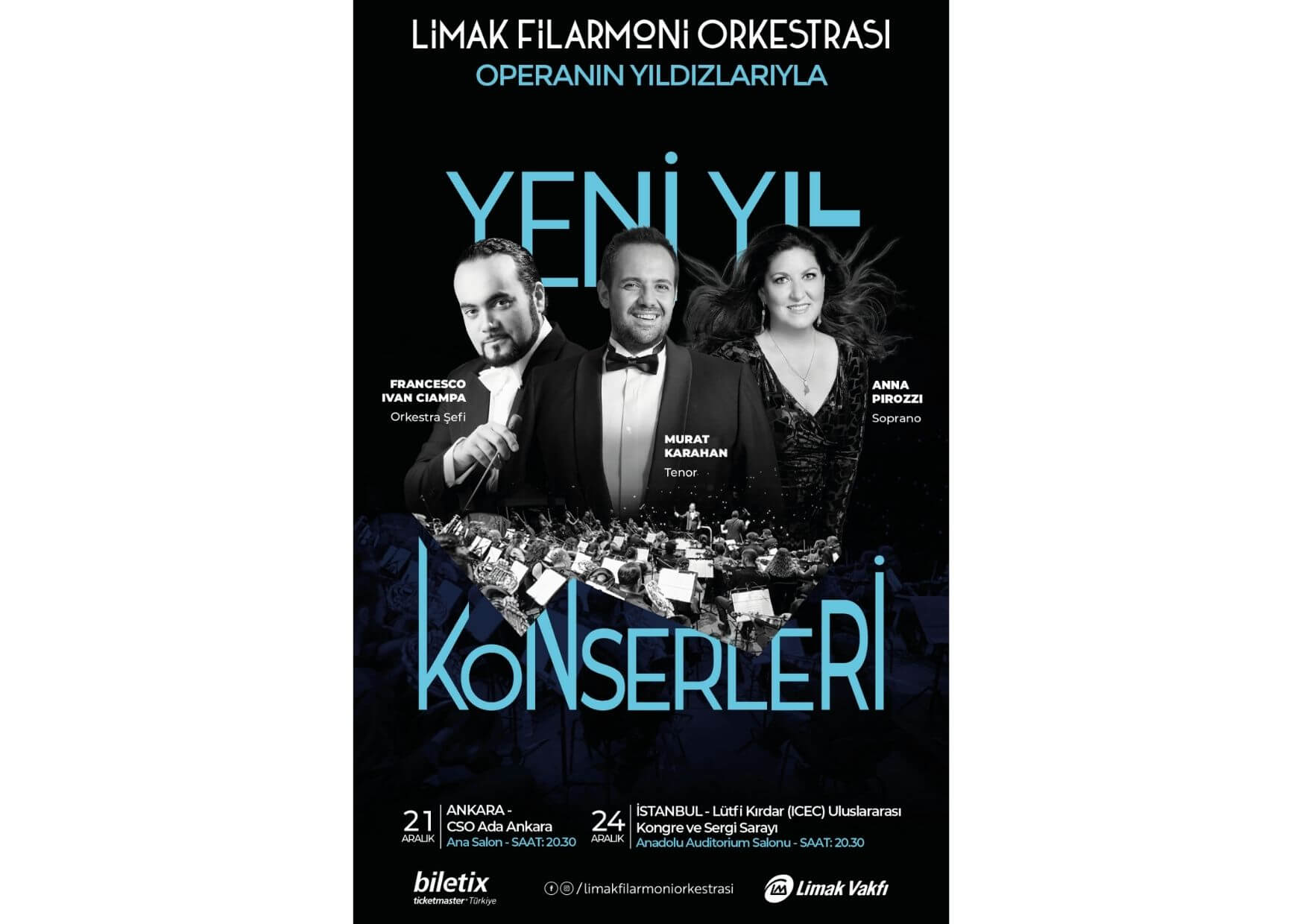 Limak Vakfı tarafından çok sesli müziği geniş kitlelere ulaştırmak amacıyla 2017 yılında kurulan Limak Filarmoni Orkestrası, beğeni toplayan konserlerine devam ediyor. Dünyanın en önemli tenorları arasında gösterilen Murat Karahan’ın sanat yönetmenliğindeki orkestra, 21 Aralık Salı günü CSO Ada Ankara’da, 24 Aralık Cuma günü ise İstanbul Lütfi Kırdar Uluslararası Kongre ve Sergi Sarayı’nda sıra dışı iki performans sunacak. Şef Francesco Ivan Ciampa’nın orkestra şefliğini yapacağı konserde, dünyanın en büyük sahnelerinde yer alan iki solist Murat Karahan ve Anna Pirozi sahne alacak.