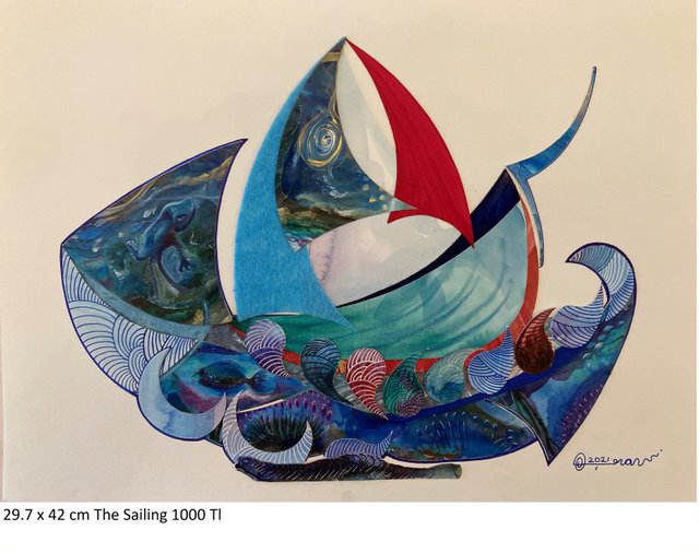 Bunun yanı sıra özgürlüğüne düşkün biri olduğum için, özgürlük demek bende hep denizi ve tekne hayatını aklıma getirmiştir. Bundan ötürüdür ki tekne ve yelkenli resimlerimi de geometrik soyutlama anlatmaya çalışıyorum.