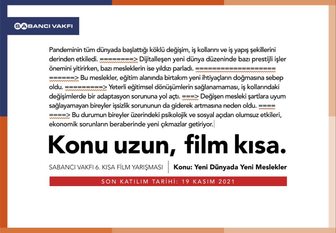 Sabancı Vakfı’nın toplumsal sorunlara sanat aracılığıyla dikkat çekmek amacıyla 2016 yılından bu yana düzenlediği Kısa Film Yarışması’nın 2021 yılı başvuruları başladı. “Konu Uzun Film Kısa” sloganı ile altıncısı gerçekleştirilecek Sabancı Vakfı Kısa Film Yarışması’nın teması “Yeni Dünyada Yeni Meslekler” olarak belirlendi. Bu yıl Kısa Film Yarışması’na başvurular 19 Kasım tarihine kadar yapılabilecek.
