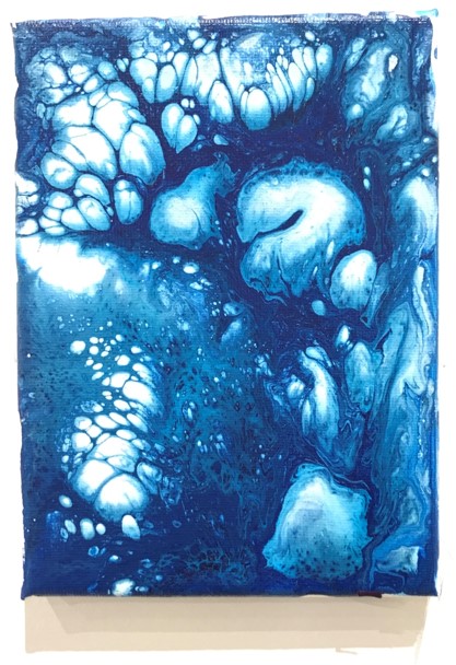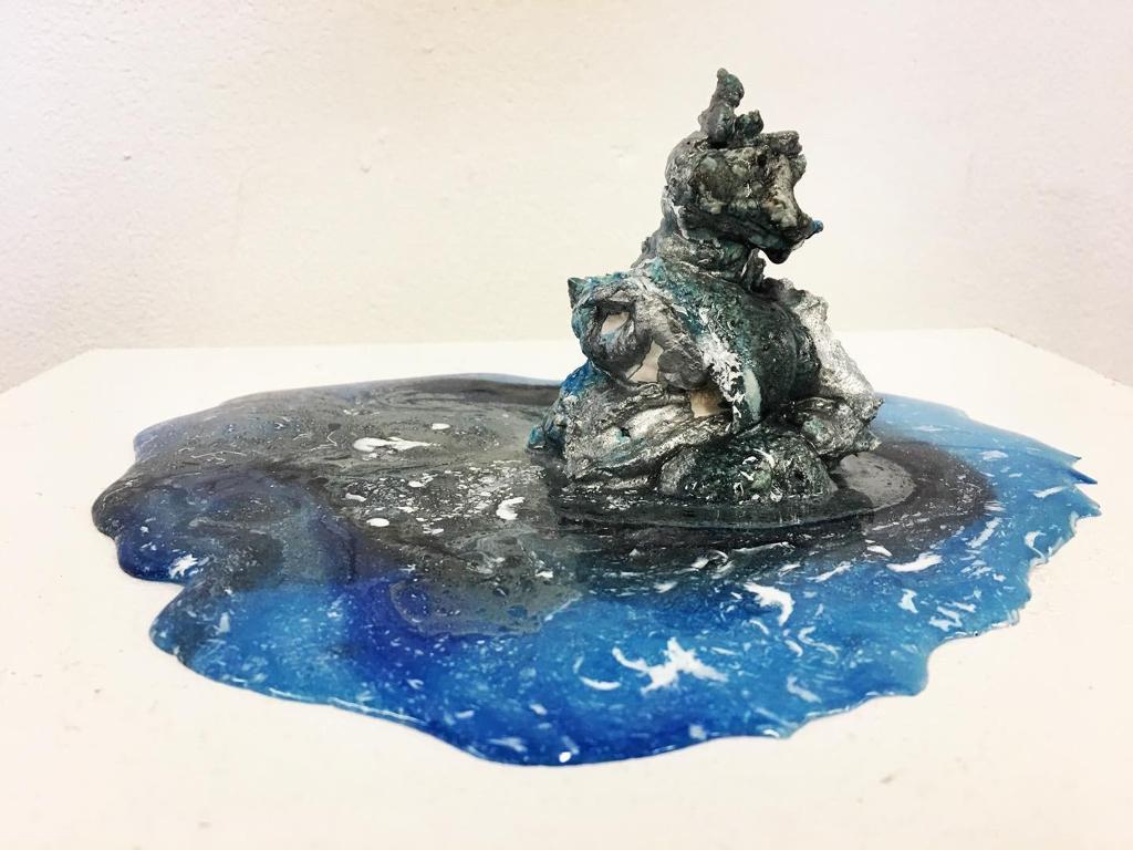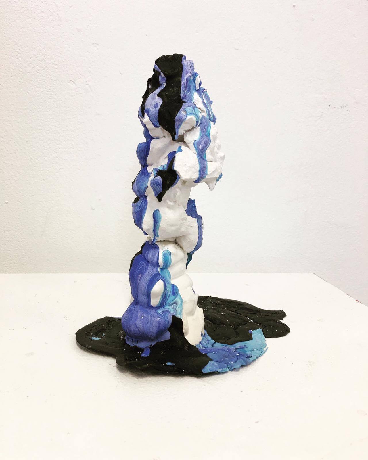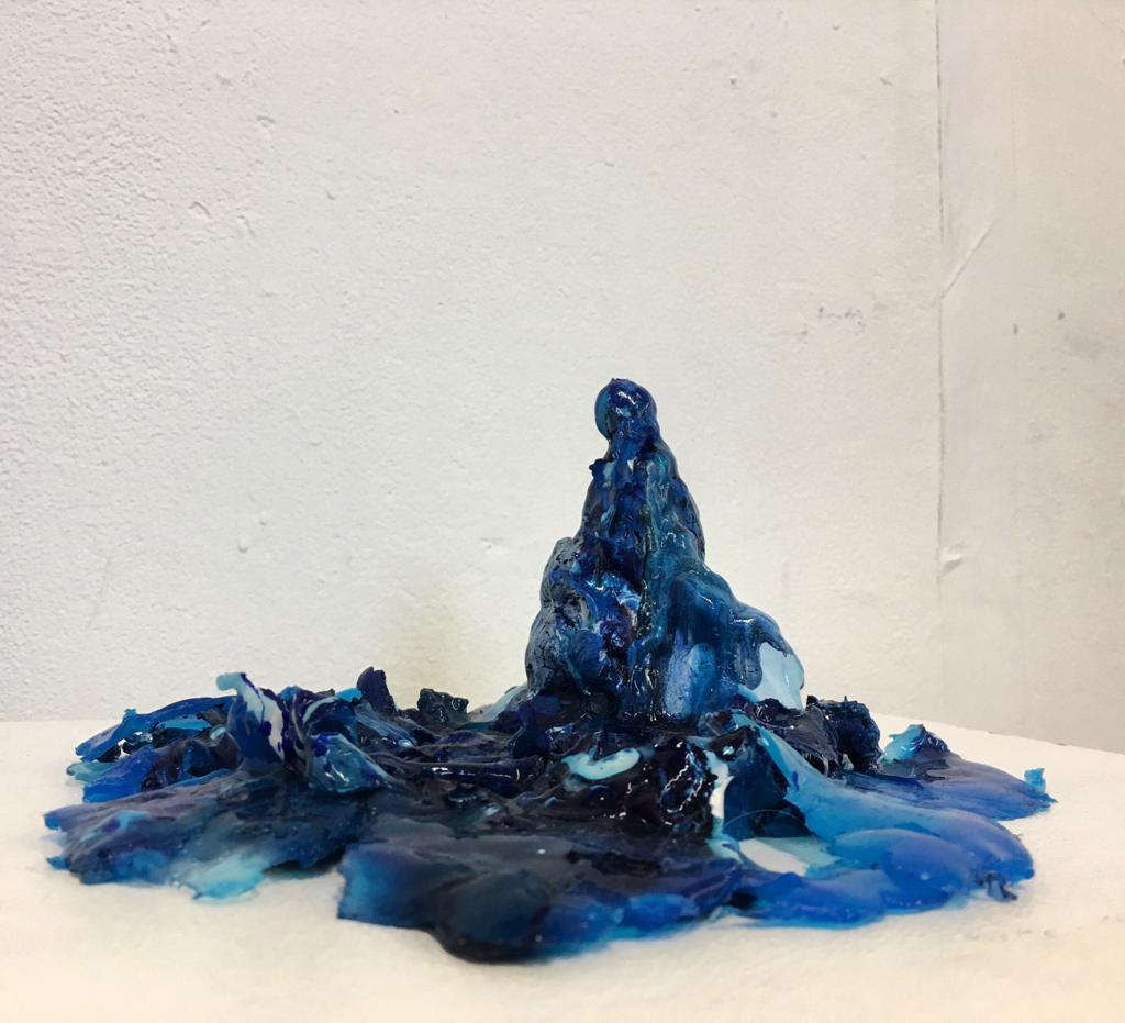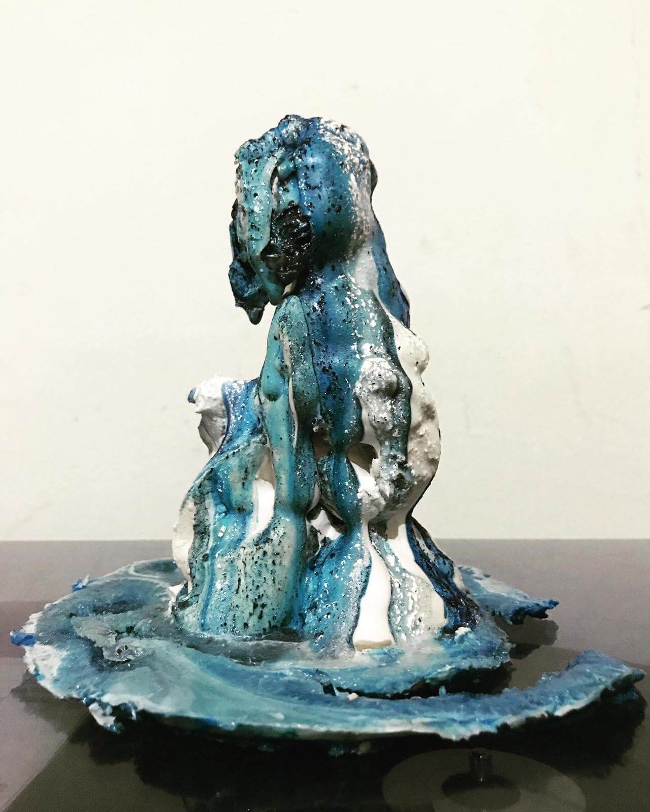 - Bu heykel Björk’ün Black Lake videosundaki görsellerden esinlenerek yapılmıştır. Björk Black Lake görsellerini İzlanda’daki buz ve gilindir mağaralarında çekmiştir. Alçının biçimsiz formları mağaraların görsellerini çağrıştırmakta ve renk uyumları destek amaçlı kullanılmaktadır. Bu işimi akrilik dökümü ile gerçekleştirdim. Altındaki destekleyici olgu şans eseri ortaya çıktı ve tabanlar üzerinde oynamamı sağladı. Tabanlar işlere karakter ve kişilik ekliyor, hepsini birbirinden ötekileştiren kişiliklere bürüyordu. Bu işimde kullandığım renkler net ve karışmamış tonlardır. Black Lake’den esinlendiğim bu tonlar işimi dramatic contrast’ın bir parçası haline getirmiştir ve yansıtmak istediği katartik duygulanımları ortaya koymamda yardımcı olmuştur.