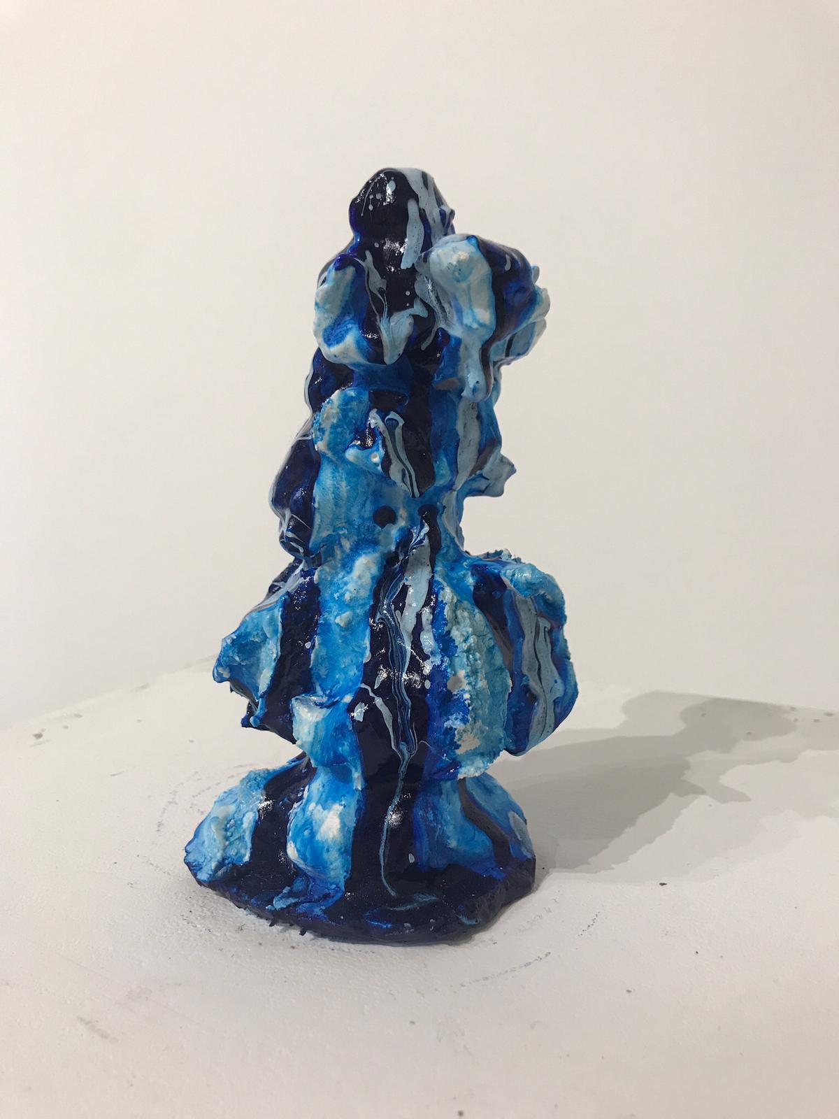 - Bu isimde plextol denen malzemeyi yağ ile deneme kararı aldım ve yağın boyalarla olan iletişimi gözlerimi kamaştırdı. Yağ boyaları parçaladı ve işin paramparça olmasına sebebiyet verdi. Bu ilk baslarda negatif bir sonuç olarak görünse de sonrasında işimin ana teması haline geldi. Plextol normalde renkleri güçlendirmek, parlatmak ve fotoğraf transferi yapmak için kullanılan bir malzemedir. Bu örnekte plextol resine bir alternatif olarak kullanılmış ve heykeli birbiriyle beraber toplu tutmak için ortaya konmuştur. Parçalanma durumu heykele yeni ve ferahlatıcı bir olgu katıp heykelin kendi kendine var olmasına yardımcı olmuştur. Björk’ün Black Lake videosundaki Blue Lava kavramının bir nevi görsel karşılığı olan bu işimin adı Mavi Lava’dır ve buna itaat eder. Nemli ve kırık görüntüler lava noktasında çağrışım yaparken plextolun transparan estetiği buzul örneklerini çağrıştırır. Bu anlamla mavi lava kendini ortaya koyar ve var olur. Bu kompozisyon aynı zamanda figüratif elementleri de içinde barındırır ve şu soruyu ön plana atar; bu bir figür müdür yoksa form mudur? Bu specific figurative sahne yalnızlık kavramlarını tartışır ve bu da yine MAVİ’de ses bulur.
