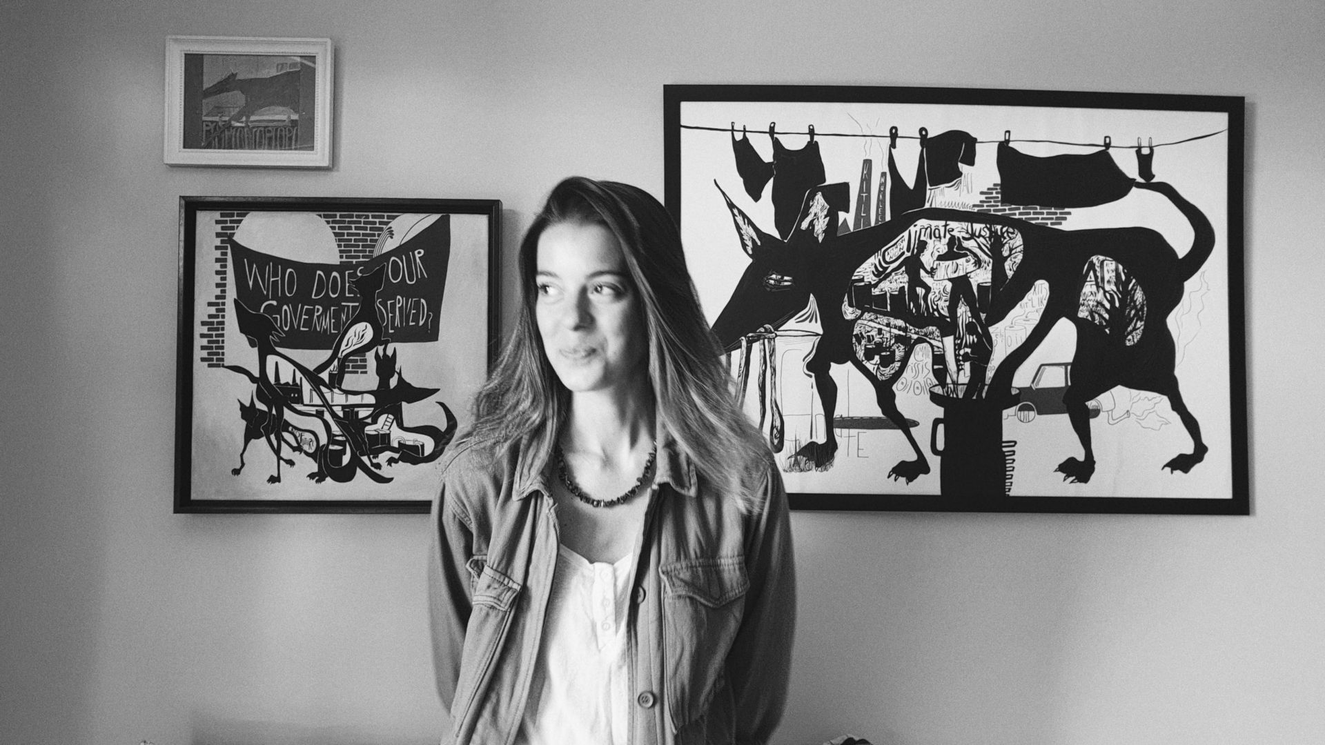 Resim yapılacak alan her neresiyse orayı düşüncelerimi boca etmek için kullanıyorum. Fikirlerimi temsil eden imgelere kelimeler ve sloganlar eşlik edebiliyor. İç içe ve bütünsel kompozisyonları grafiksel bir dille ele alıyorum. Bu yöntemin temizliği ve doğrudanlığını seviyorum.